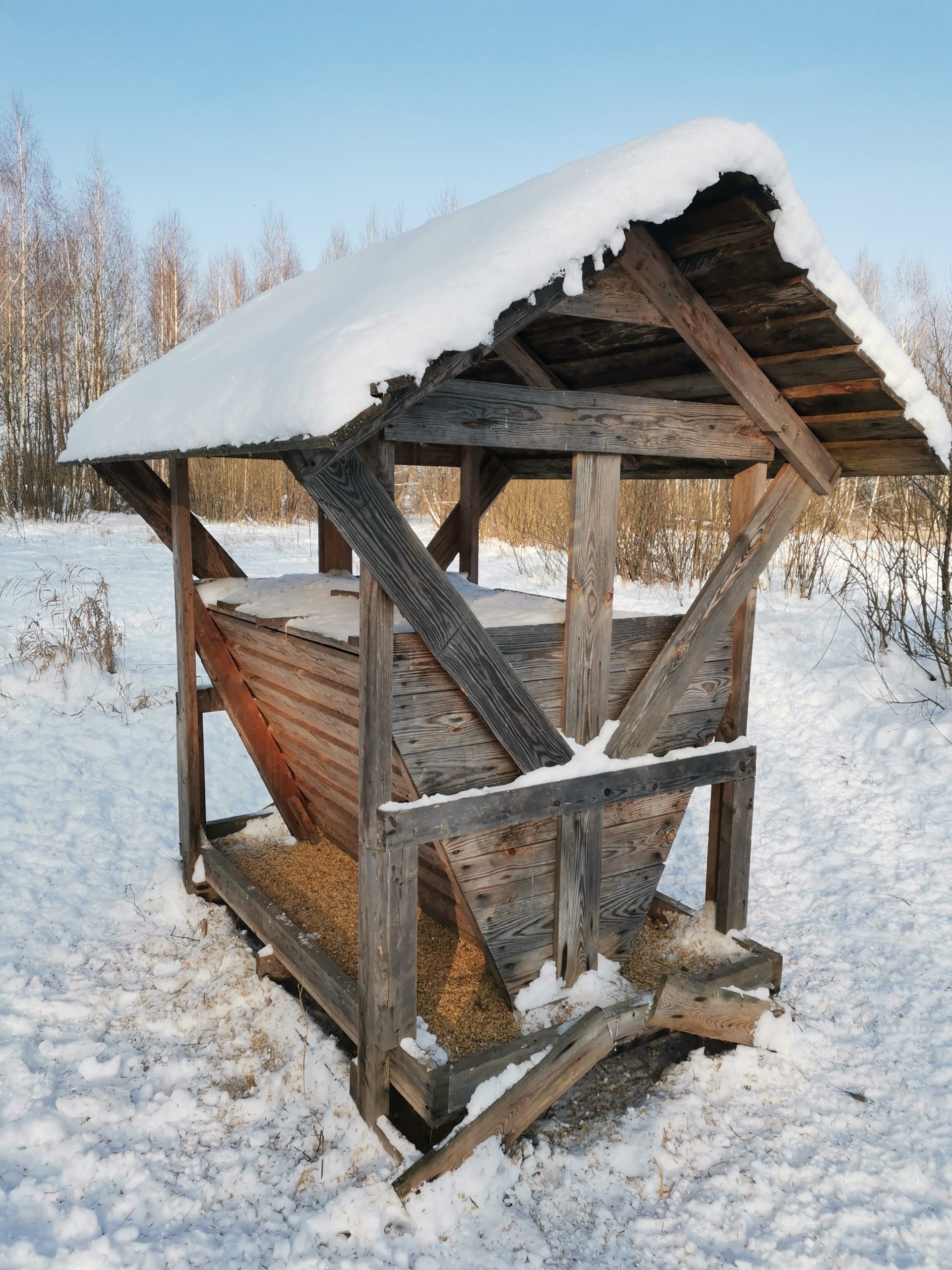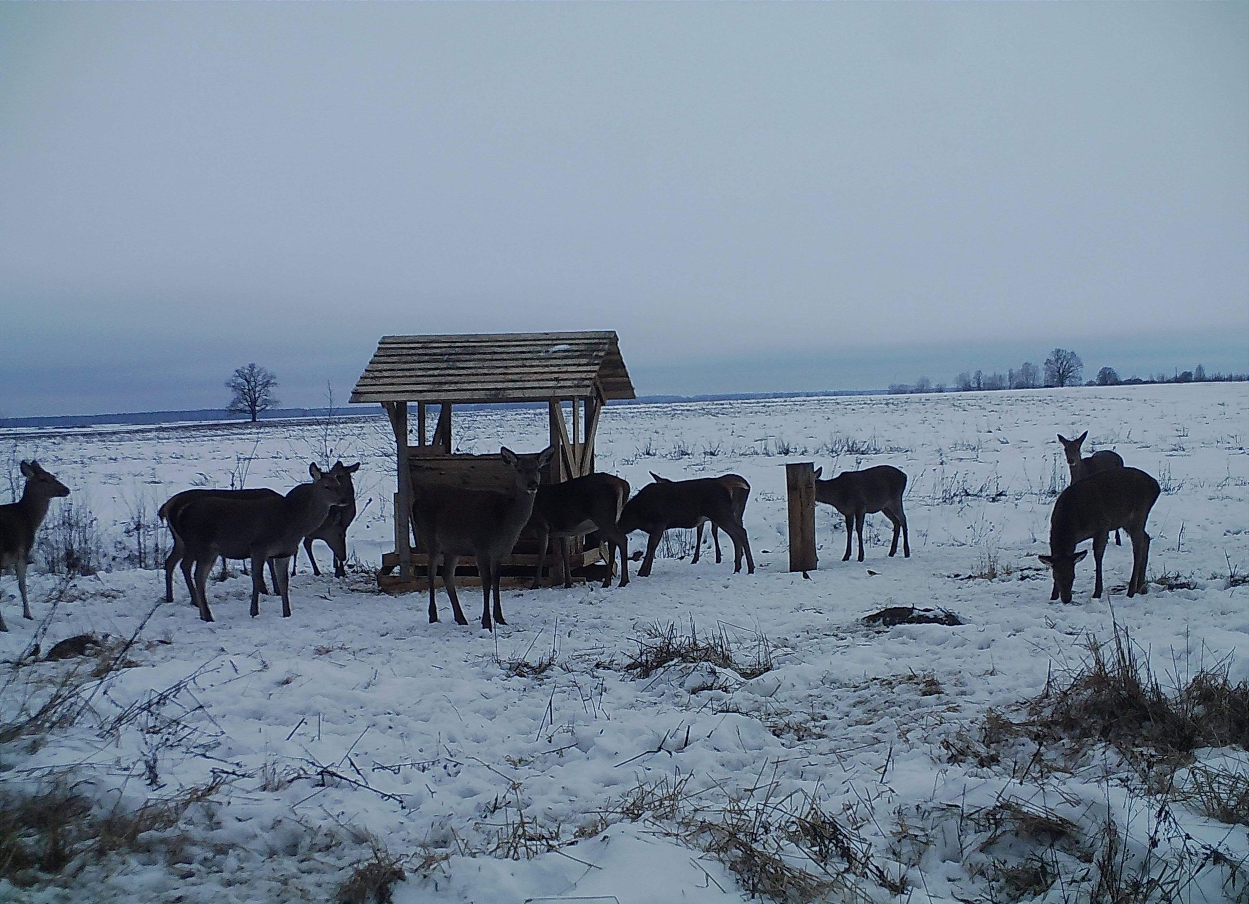 В охотхозяйстве 10 кормушек бункерного типа. Их размещают в местах наибольшей концентрации животных. В один бункер загружают 12—15 мешков овса, в каждом — около 30 кг. Расход не очень большой: так, на поверку в кормушке за 10 январских морозных дней съедено было менее половины. Это не только действенная помощь животным пережить тяжелые погодные условия, но и способ удержать популяцию оленя благородного, в разведение которого было вложено много сил и средств, на территории собственного охотхозяйства.